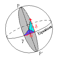 rispettivamente, dall'equatore verso il Polo celeste (P) e